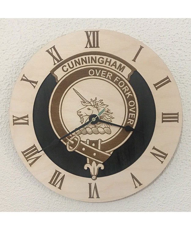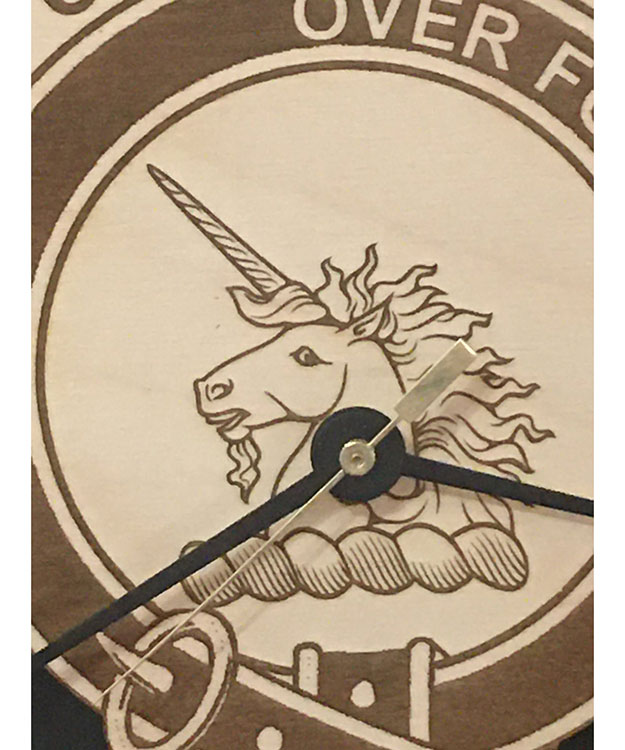 Your Clan Crest Buckle will be displayed proudly as a 3D wood clock. Every detail engraved to precision. Size 11 inches in diameter. It has an attached hanger on the back of the clock mechanism for easy wall display. Batteries not included.