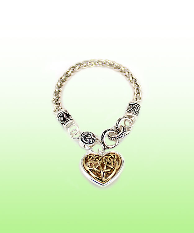 Two tone Celtic Heart Bracelet- features thick link chain bracelet with a large lobster clasp that holds the two tone Celtic Heart. Has three linked rings to adjust length of bracelet for variety of wrist sizes. See also our coordinating necklace.