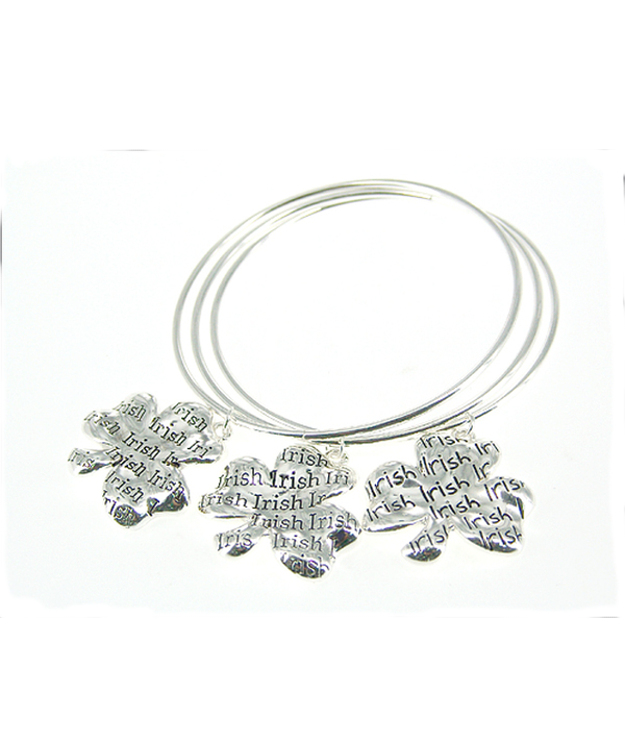 Three shamrocks charms with three different fonts of the word Irish on three bangles