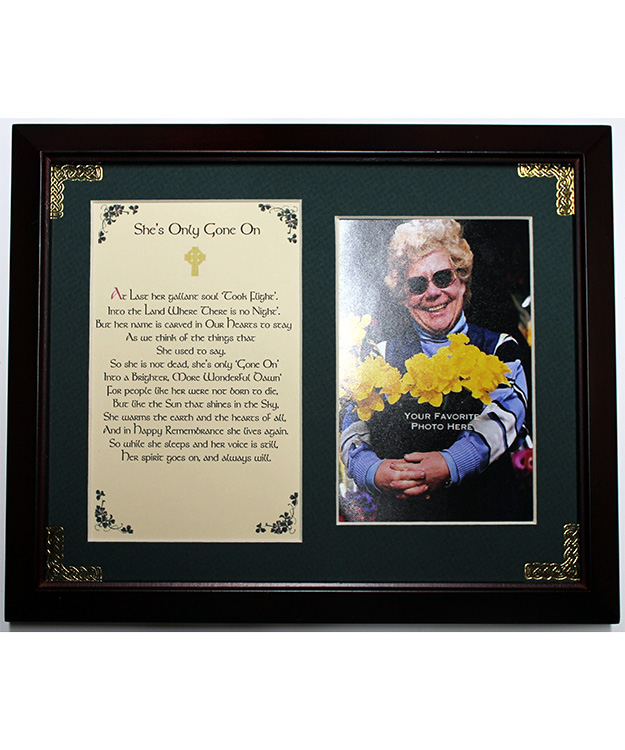This 8 x 10 inch blessing comes printed on an ivory paper card stock. The photo opening holds a 4x6 inch photograph. The forest green matte has been hand embossed with a Celtic knot work embellishment. The frame is a dark walnut wood frame of Italian design with both an easel and a hanger for display.