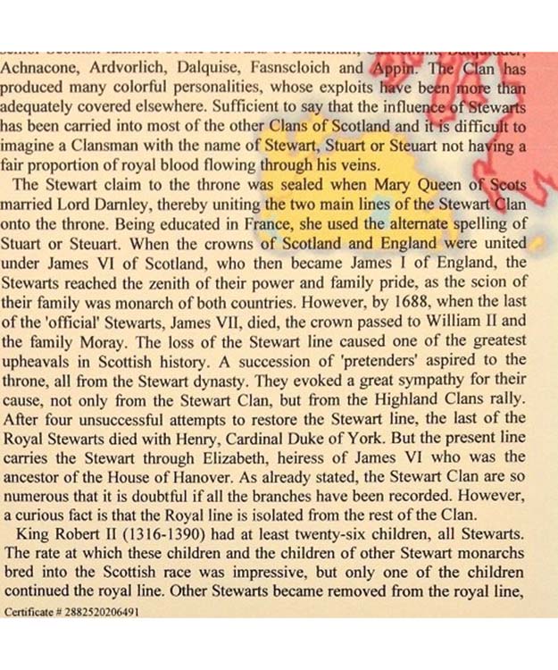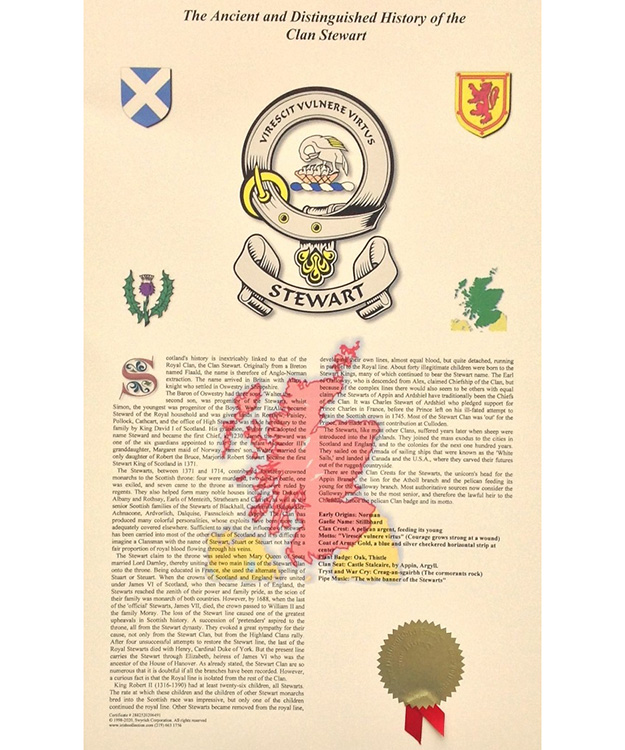 One of our most popular products - The full color rendition of the Clan Badge and Surname History. The history combines our time tested Surname history with a full color rendition of the earliest clan badge once associated with a bearer of the surname, and our seal of Authenticity. When displayed proudly on your entrance way, family room or den, this print will be the center of attention. Each History includes: Full color Family Clan Badge; Ancient origin of the name; Spelling variations; Early movement of the surname during the Middle Ages; Noteworthy bearers from the 1500-1600s; First settlers to North America; Contemporary notable bearers of the name or variants; Unique Certificate number; Gold seal guaranteeing the authenticity; and Full Color Watermark of the country of origin. Clan histories can be up to 1,800 words long and is printed on an 11"x17" ivory scroll. Shipped flat.