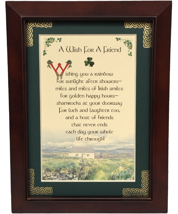 This 5 inch by 7 inch blessing comes printed on an ivory paper card stock. The forest green matte has been hand embossed with a Celtic knot work embellishment. The frame is a dark walnut wood frame of Italian design and both an easel and a hanger for display.