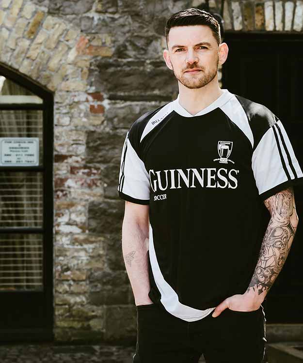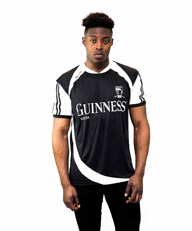 A high-quality sporty fit Soccer Jersey in black with white panels, featuring a selection of excellently printed Guinness® related details such as the Guinness Logo and printed pint label on the front. The back features a printed 'ESTD 1759', a tribute to the year Guinness was founded.