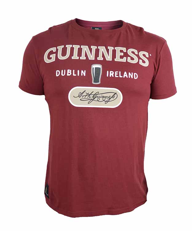 Guinness Signature Burgundy crew neck tee. Wear it over a classic hoodie or sweatshirt for a more relaxed look. Considered a Loose, fuller cut fit with a little extra room through the chest and body for complete comfort. This is a favorite among Men & Women during spring in Ireland. Full Burgundy body with 'Guinness Logo with the Trademark Arthur Guinness Signature ' print across the chest. Side Guinness Harp & Logo to the hem.