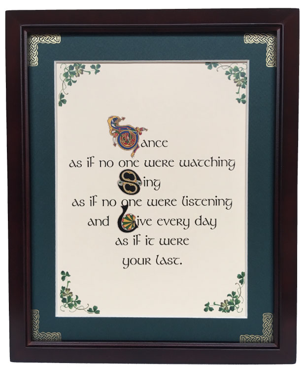 This 8 inch by 10 inch blessing comes printed on an ivory paper card stock. The forest green matte has been hand embossed with a Celtic knot work embellishment. The frame is a dark walnut wood frame of Italian design and both an easel and a hanger for display.