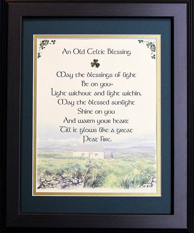 This 16 inch by 20 inch blessing comes printed on an ivory paper card stock with a double green over gold matting. The frame is a 1 inch thick walnut frame with hanger backing.
