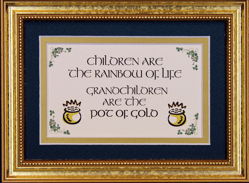 Our whimsical Irish blessings come double matted under glass in a gold gilt frame with easel and hanger attached. Size 5 inches high x 7 inches wide