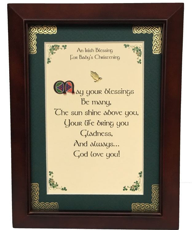 This 5 inch by 7 inch blessing comes printed on an ivory paper card stock. The forest green matte has been hand embossed with a Celtic knot work embellishment. The frame is a dark walnut wood frame of Italian design and both an easel and a hanger for display.