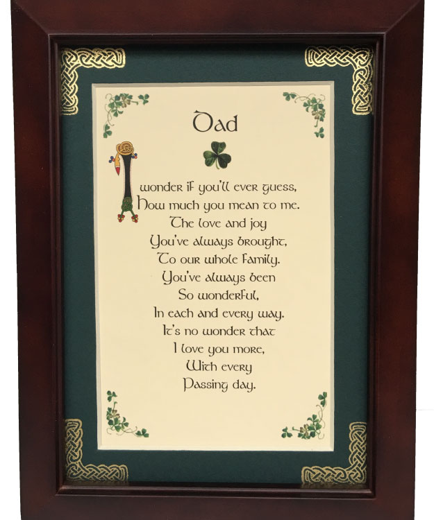 This 5 inch by 7 inch blessing comes printed on an ivory paper card stock. The forest green matte has been hand embossed with a Celtic knot work embellishment. The frame is a dark walnut wood frame of Italian design and both an easel and a hanger for display.
