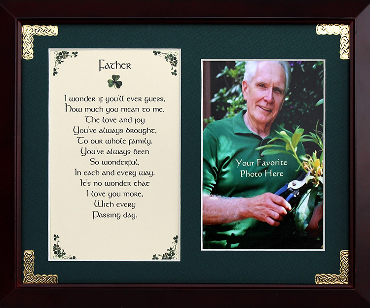 This 8 x 10 inch blessing comes printed on an ivory paper card stock. The photo opening holds a 4x6 inch photograph. The forest green matte has been hand embossed with a Celtic knot work embellishment. The frame is a dark walnut wood frame of Italian design with both an easel and a hanger for display.
