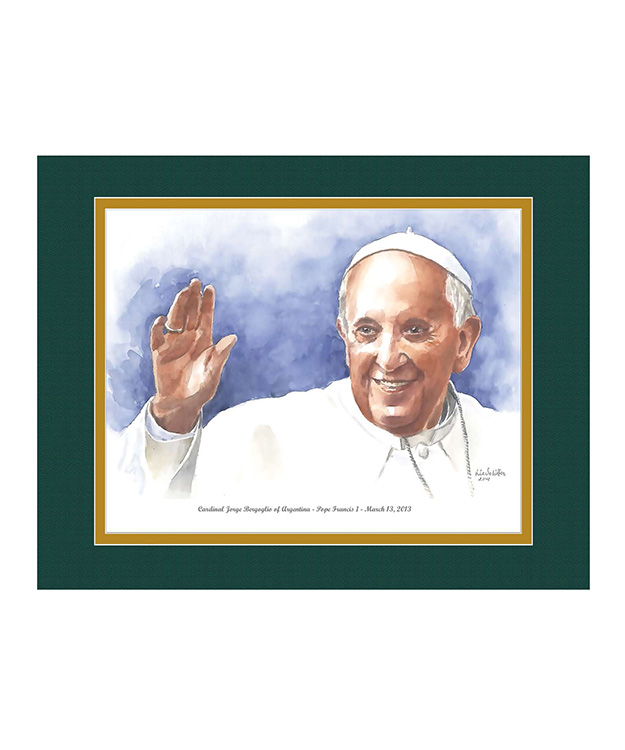 This 11"x14" watercolor print has a green over gold matting is printed directly on to the print. The print is presented in a crystal clear bag with a backing board.