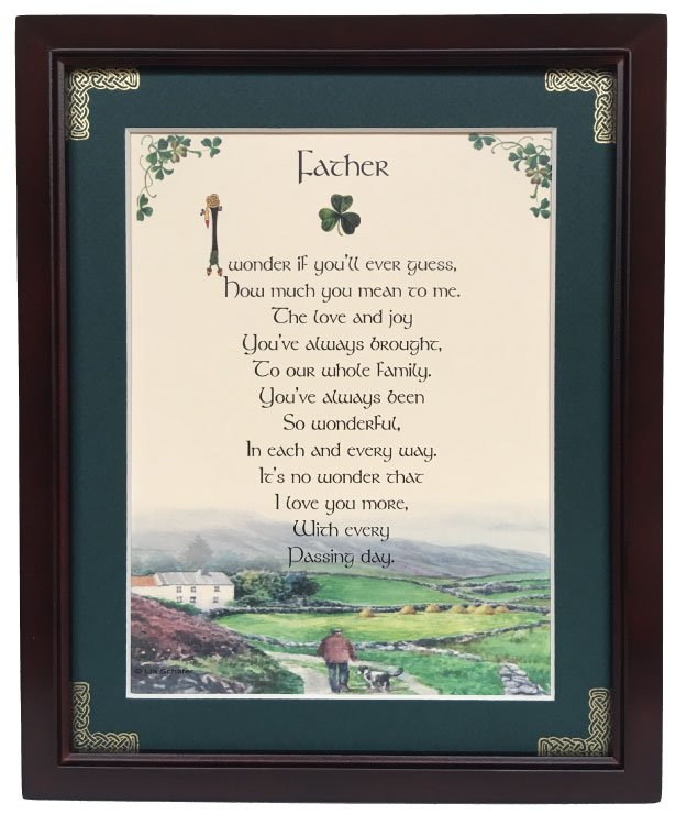 This 8 inch by 10 inch blessing comes printed on an ivory paper card stock. The forest green matte has been hand embossed with a Celtic knot work embellishment. The frame is a dark walnut wood frame of Italian design and both an easel and a hanger for display.