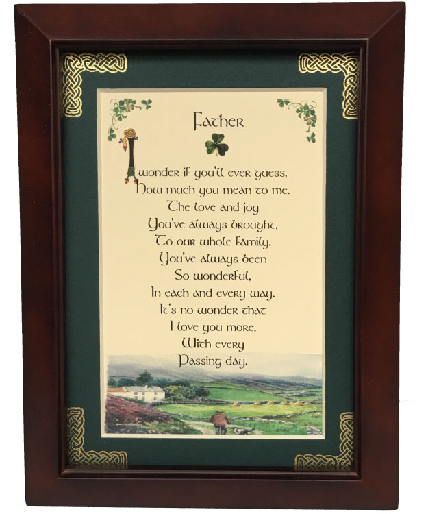 This 5 inch by 7 inch blessing comes printed on an ivory paper card stock. The forest green matte has been hand embossed with a Celtic knot work embellishment. The frame is a dark walnut wood frame of Italian design and both an easel and a hanger for display.
