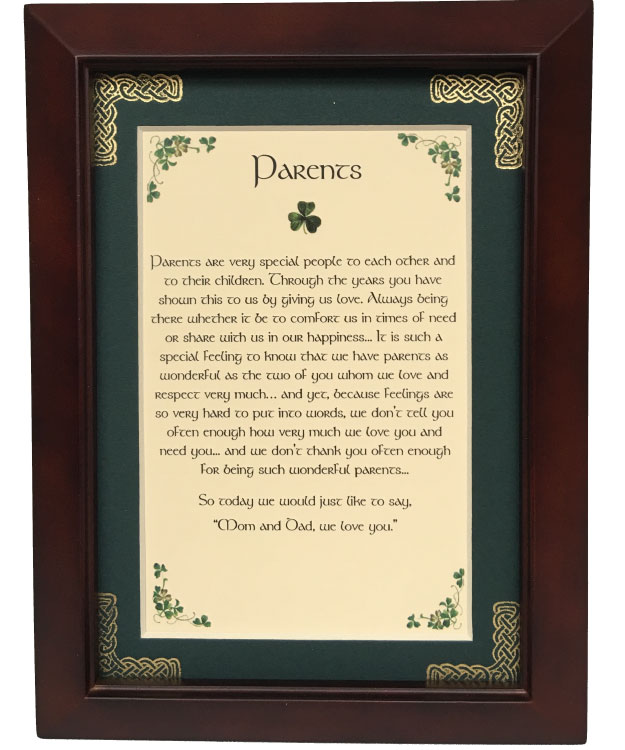 This 5 inch by 7 inch blessing comes printed on an ivory paper card stock. The forest green matte has been hand embossed with a Celtic knot work embellishment. The frame is a dark walnut wood frame of Italian design and both an easel and a hanger for display.