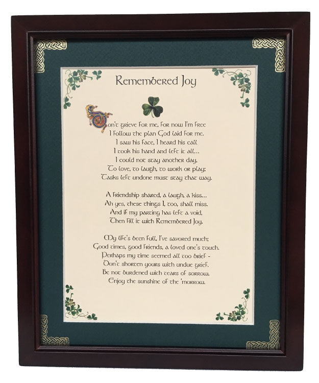 Don’t grieve for me, for now I’m free I follow the plan God laid for me. I saw his face, I heard his call I took his hand and left it all… I could not stay another day, To love, to laugh, to work or play; Tasks left undone must stay that way. A friendship shared, a laugh, a kiss… Ah yes, these things I, too, shall miss. And if my parting has left a void, Then fill it with Remembered Joy. My life’s been full, I’ve savored much; Good times, good friends, a loved one’s touch. Perhaps my time seemed all too brief - Don’t shorten yours with undue grief. Be not burdened with tears of sorrow. Enjoy the sunshine of the ’morrow.