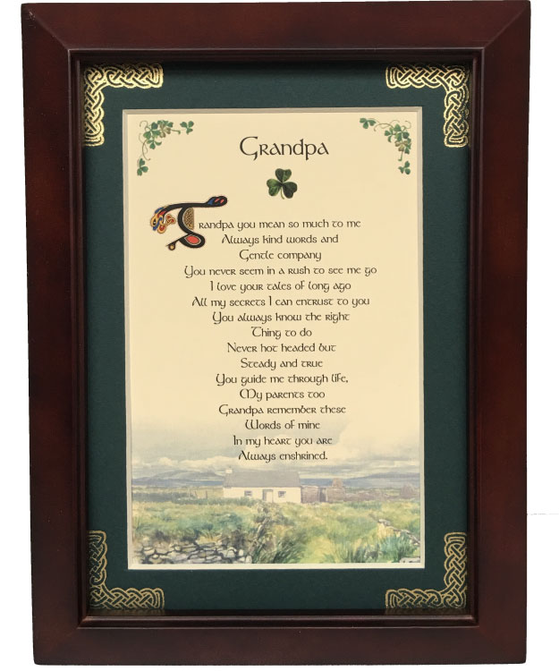 This 5 inch by 7 inch blessing comes printed on an ivory paper card stock. The forest green matte has been hand embossed with a Celtic knot work embellishment. The frame is a dark walnut wood frame of Italian design and both an easel and a hanger for display.