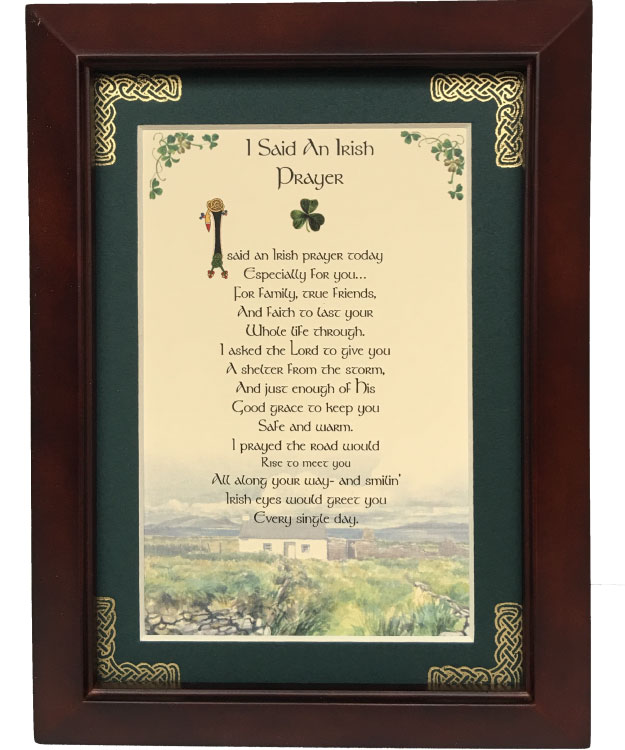 This 5 inch by 7 inch blessing comes printed on an ivory paper card stock. The forest green matte has been hand embossed with a Celtic knot work embellishment. The frame is a dark walnut wood frame of Italian design and both an easel and a hanger for display.