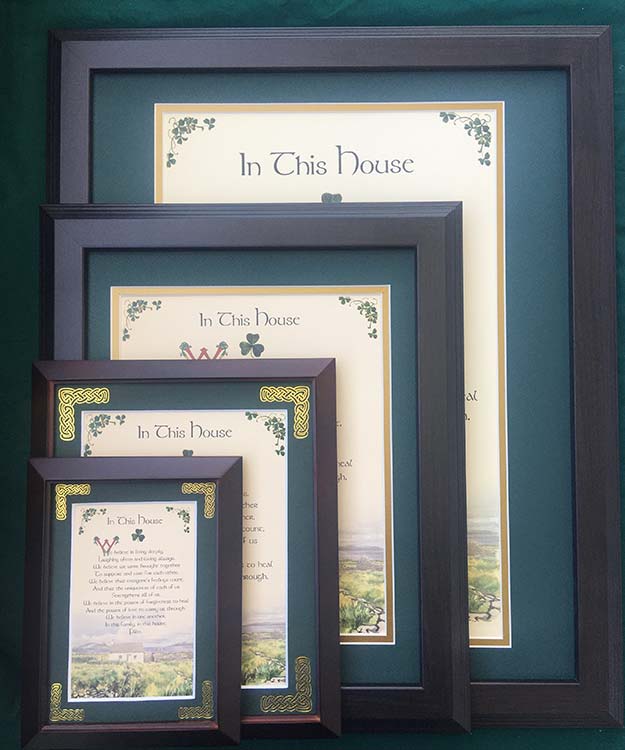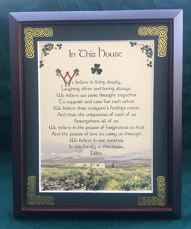 This 8 inch by 10 inch blessing comes printed on an ivory paper card stock. The forest green matte has been hand embossed with a Celtic knot work embellishment. The frame is a dark walnut wood frame of Italian design and both an easel and a hanger for display.