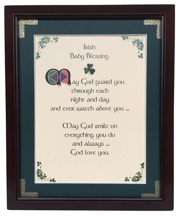 This 8 inch by 10 inch blessing comes printed on an ivory paper card stock. The forest green matte has been hand embossed with a Celtic knot work embellishment. The frame is a dark walnut wood frame of Italian design and has both an easel and a hanger for display.