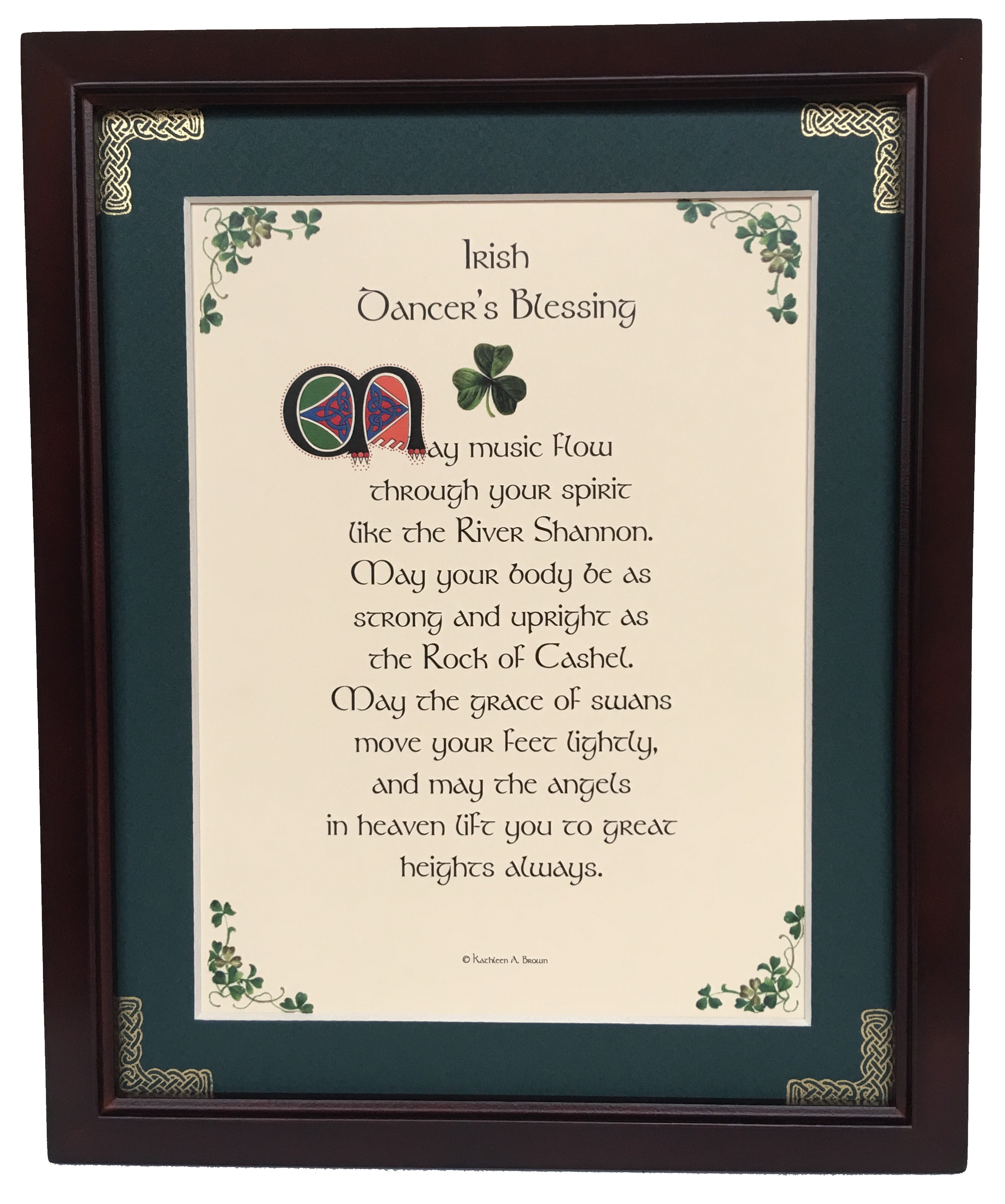 This 8 inch by 10 inch blessing comes printed on an ivory paper card stock. The forest green matte has been hand embossed with a Celtic knot work embellishment. The frame is a dark walnut wood frame of Italian design and has both an easel and a hanger for display.