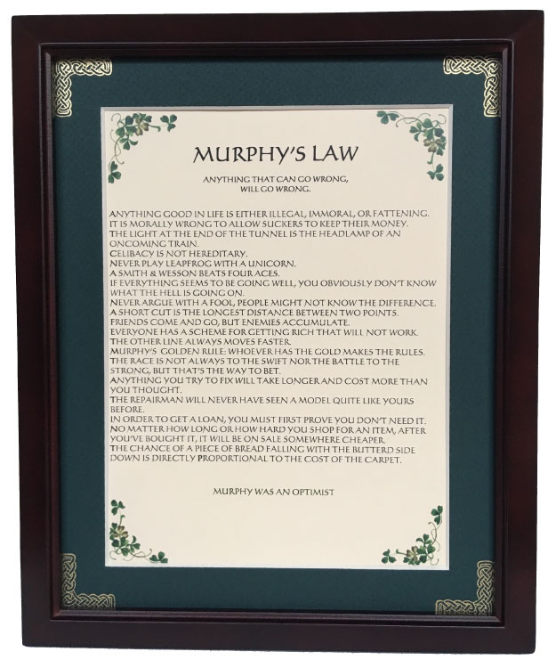ANYTHING THAT CAN GO WRONG, WILL GO WRONG. Anything good in life is either illegal, immoral, or fattening. It is morally wrong to allow suckers to keep their money. The light at the end of the tunnel is the headlamp of an oncoming train. Celibacy is not hereditary. Never play leapfrog with a unicorn. A Smith & Wesson beats four aces. If everything seems to be going well, you obviously don’t know what the hell is going on. Never argue with a fool, people might not know the difference. A short cut is the longest distance between two points. Friends come and go, but enemies accumulate. Everyone has a scheme for getting rich that will not work. The other line always moves faster. Murphy’s golden rule: whoever has the gold makes the rules. The race is not always to the swift nor the battle to the strong, but that’s the way to bet. Anything you try to fix will take longer and cost more than you thought. The repairman will never have seen a model quite like yours before. In order to get a loan, you must first prove you don’t need it. No matter how long or how hard you shop for an item, after you’ve bought it, it will be on sale somewhere cheaper. The chance of a piece of bread falling with the buttered side down is directly proportional to the cost of the carpet. MURPHY WAS AN OPTIMIST
