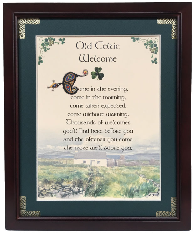 This 8 inch by 10 inch blessing comes printed on an ivory paper card stock. The forest green matte has been hand embossed with a Celtic knot work embellishment. The frame is a dark walnut wood frame of Italian design and both an easel and a hanger for display.