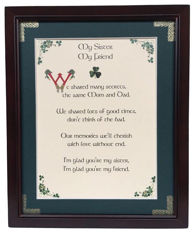 We shared many secrets, The same Mom and Dad. We shared lots of good times, Don’t think of the bad. Our memories we’ll cherish With love without end. I’m glad you’re my sister, I’m glad you’re my friend.