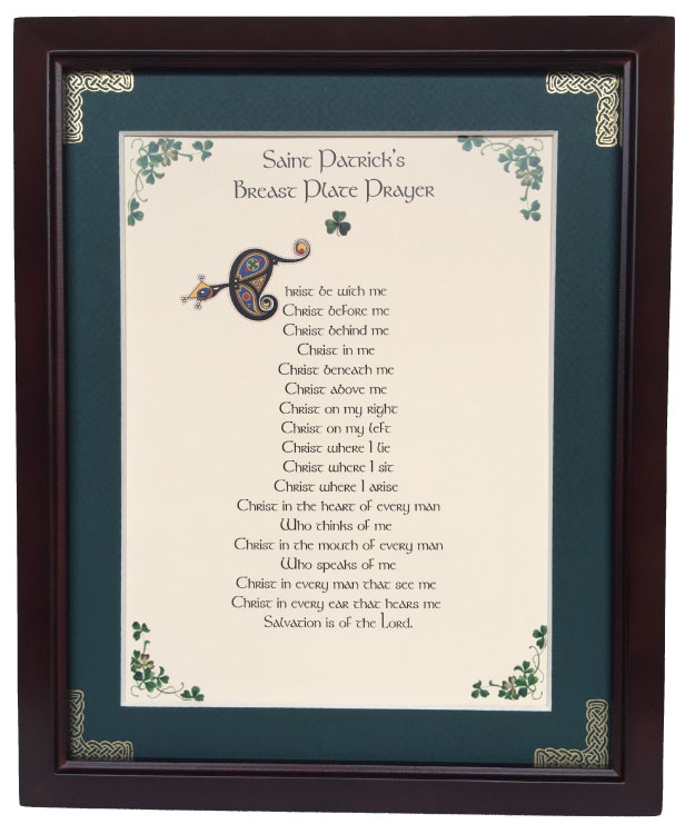 This 8 inch by 10 inch blessing comes printed on an ivory paper card stock. The forest green matte has been hand embossed with a Celtic knot work embellishment. The frame is a dark walnut wood frame of Italian design and both an easel and a hanger for display.