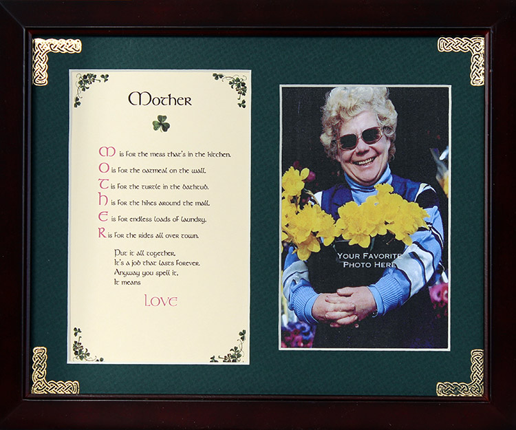 This 8 x 10 inch blessing comes printed on an ivory paper card stock. The photo opening holds a 4x6 inch photograph. The forest green matte has been hand embossed with a Celtic knot work embellishment. The frame is a dark walnut wood frame of Italian design with both an easel and a hanger for display.