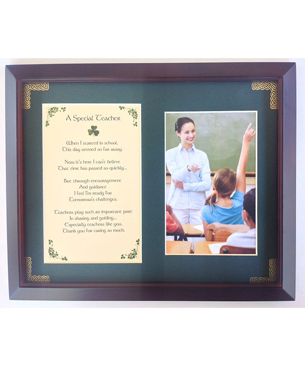 This 8 x 10 inch blessing comes printed on an ivory paper card stock. The photo opening holds a 4x6 inch photograph.The forest green matte has been hand embossed with a Celtic knot work embellishment. The frame is a dark walnut wood frame of Italian design with both an easel and a hanger for display
