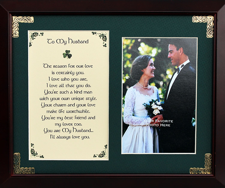This 8 x 10 inch blessing comes printed on an ivory paper card stock. The photo opening holds a 4x6 inch photograph. The forest green matte has been hand embossed with a Celtic knot work embellishment. The frame is a dark walnut wood frame of Italian design with both an easel and a hanger for display.
