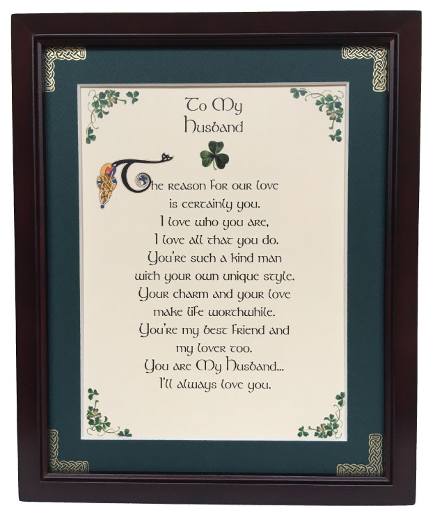 This 8 inch by 10 inch blessing comes printed on an ivory paper card stock. The forest green matte has been hand embossed with a Celtic knot work embellishment. The frame is a dark walnut wood frame of Italian design and both an easel and a hanger for display.
