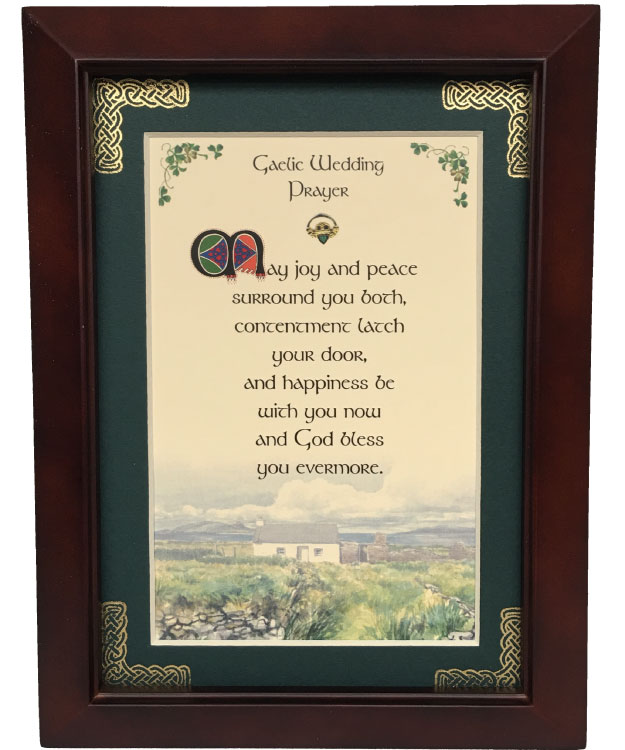 This 5 inch by 7 inch blessing comes printed on an ivory paper card stock. The forest green matte has been hand embossed with a Celtic knot work embellishment. The frame is a dark walnut wood frame of Italian design and both an easel and a hanger for display.
