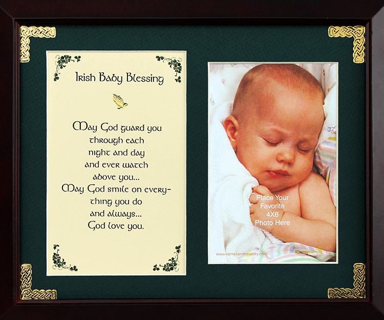 This 8 x 10 inch blessing comes printed on an ivory paper card stock. The photo opening holds a 4x6 inch photograph. The forest green matte has been hand embossed with a Celtic knot work embellishment. The frame is a dark walnut wood frame of Italian design and both an easel and a hanger for display.