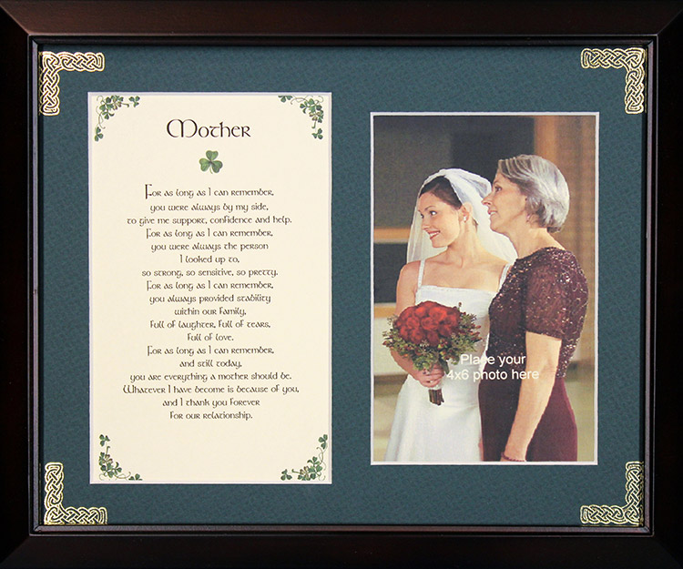 This 8 x 10 inch blessing comes printed on an ivory paper card stock. The photo opening holds a 4x6 inch photograph. The forest green matte has been hand embossed with a Celtic knot work embellishment. The frame is a dark walnut wood frame of Italian design with both an easel and a hanger for display.