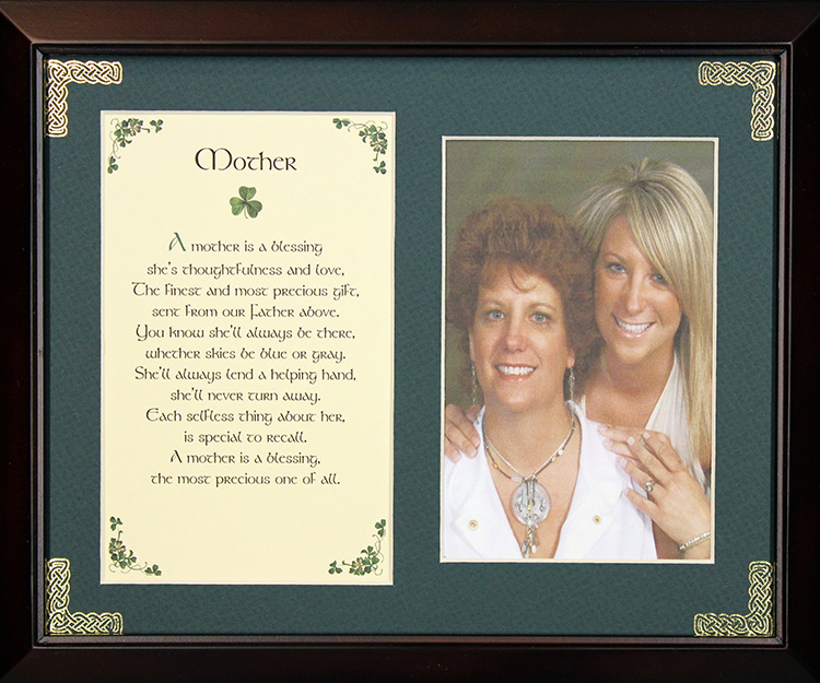 This 8 x 10 inch blessing comes printed on an ivory paper card stock. The photo opening holds a 4x6 inch photograph. The forest green matte has been hand embossed with a Celtic knot work embellishment. The frame is a dark walnut wood frame of Italian design with both an easel and a hanger for display.