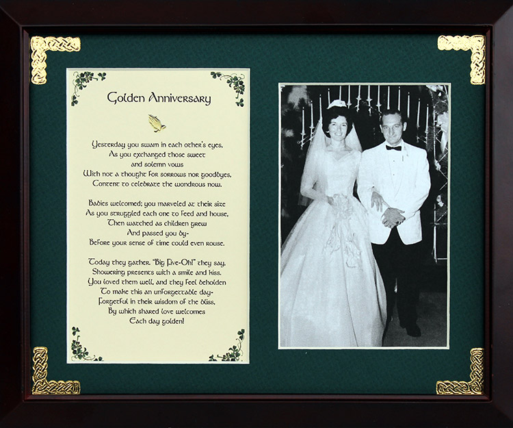 Yesterday you swam in each other’s eyes, As you exchanged those sweet and solemn vows With not a thought for sorrows nor goodbyes, Content to celebrate the wondrous now. Babies welcomed; you marveled at their size As you struggled each one to feed and house, Then watched as children grew And passed you by- Before your sense of time could even rouse. Today they gather. “Big Five-Oh!” they say, Showering presents with a smile and kiss. You loved them well, and they feel beholden To make this an unforgettable day- Forgetful in their wisdom of the bliss, By which shared love welcomes Each day golden!.