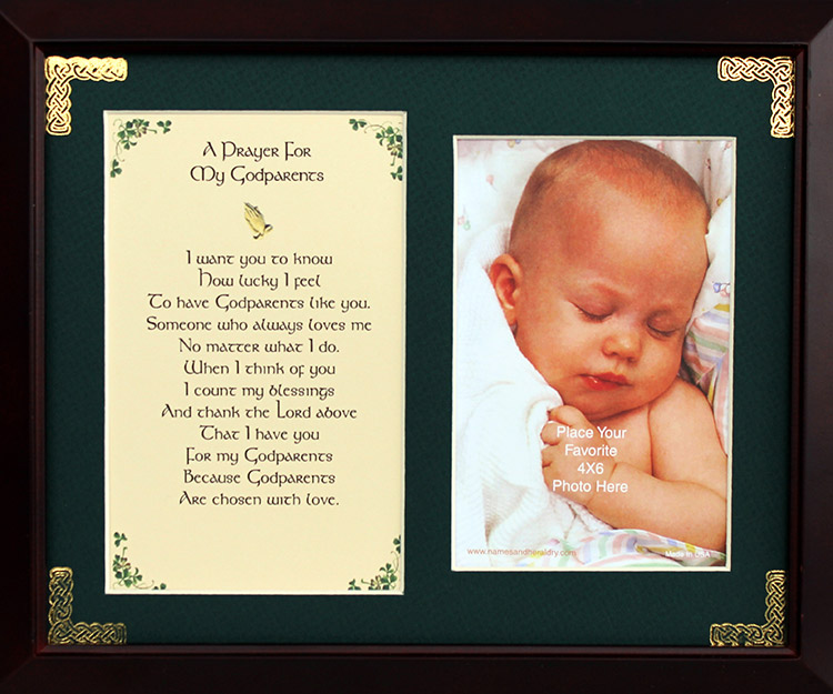 This 8 x 10 inch blessing comes printed on an ivory paper card stock. The photo opening holds a 4x6 inch photograph.The forest green matte has been hand embossed with a Celtic knot work embellishment. The frame is a dark walnut wood frame of Italian design and both an easel and a hanger for display