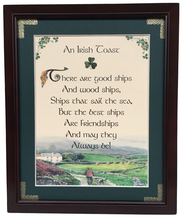 This 8 inch by 10 inch blessing comes printed on an ivory paper card stock. The forest green matte has been hand embossed with a Celtic knot work embellishment. The frame is a dark walnut wood frame of Italian design and has both an easel and a hanger for display.