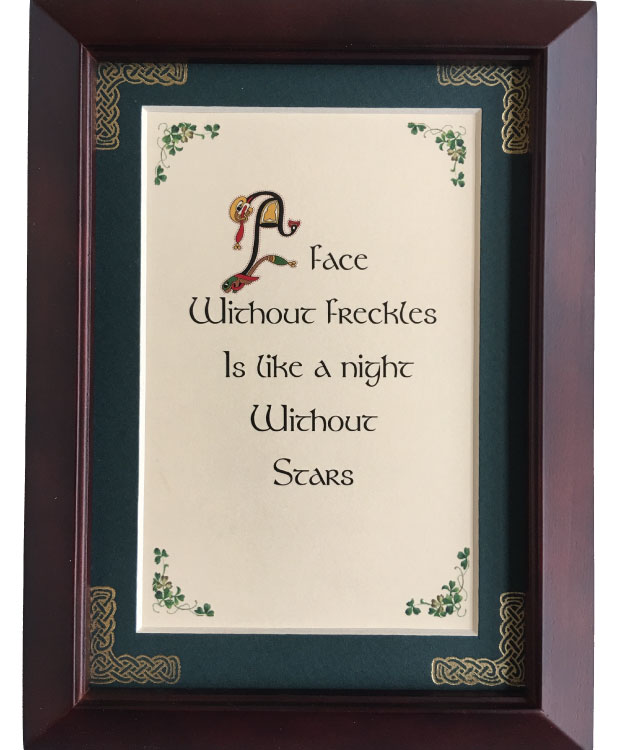 This 5 inch by 7 inch blessing comes printed on an ivory paper card stock. The forest green matte has been hand embossed with a Celtic knot work embellishment. The frame is a dark walnut wood frame of Italian design and both an easel and a hanger for display.