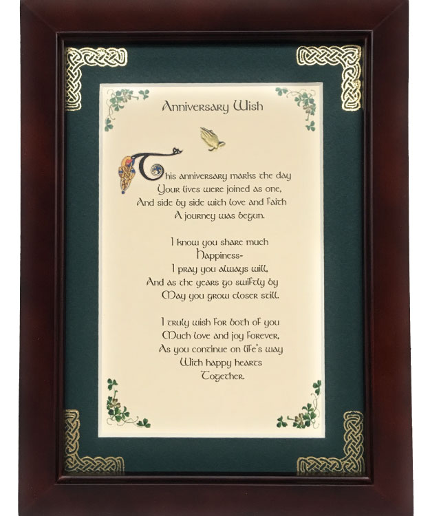 This 5 inch by 7 inch blessing comes printed on an ivory paper card stock. The forest green matte has been hand embossed with a Celtic knot work embellishment. The frame is a dark walnut wood frame of Italian design and both an easel and a hanger for display.