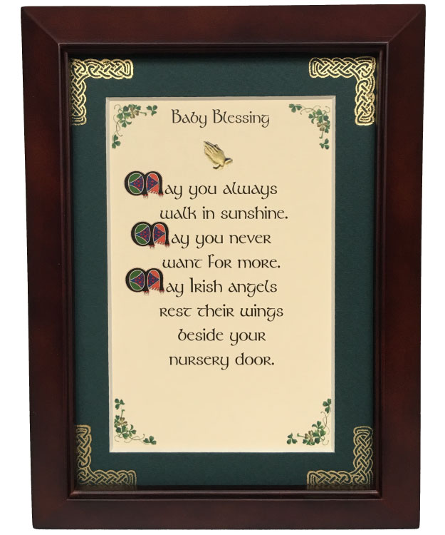 This 5 inch by 7 inch blessing comes printed on an ivory paper card stock. The forest green matte has been hand embossed with a Celtic knot work embellishment. The frame is a dark walnut wood frame of Italian design and both an easel and a hanger for display.