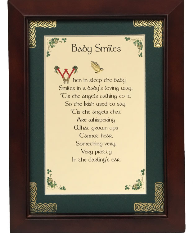 When in sleep the baby Smiles in a baby’s loving way. ‘Tis the angels talking to it, So the Irish used to say. ‘Tis the angels that are whispering What grown ups cannot hear, Something very, very pretty In the darling’s ear.
