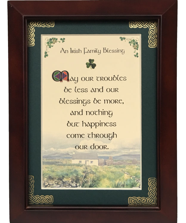 This 5 inch by 7 inch blessing comes printed on an ivory paper card stock. The forest green matte has been hand embossed with a Celtic knot work embellishment. The frame is a dark walnut wood frame of Italian design and both an easel and a hanger for display.
