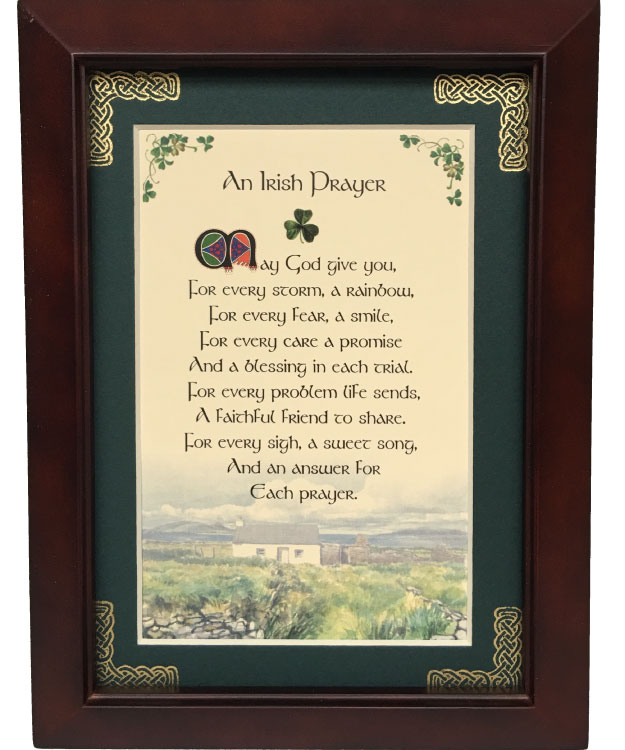 This 5 inch by 7 inch blessing comes printed on an ivory paper card stock. The forest green matte has been hand embossed with a Celtic knot work embellishment. The frame is a dark walnut wood frame of Italian design and both an easel and a hanger for display.