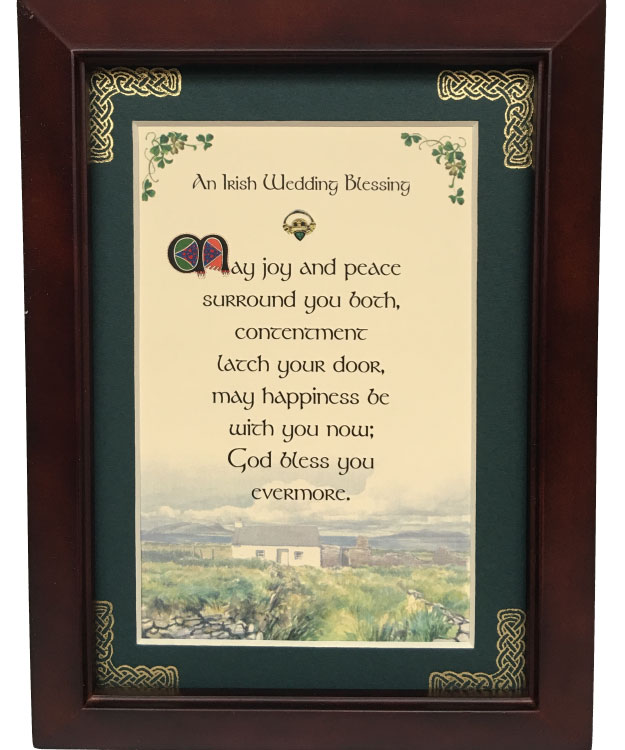 This 5 inch by 7 inch blessing comes printed on an ivory paper card stock. The forest green matte has been hand embossed with a Celtic knot work embellishment. The frame is a dark walnut wood frame of Italian design and both an easel and a hanger for display.