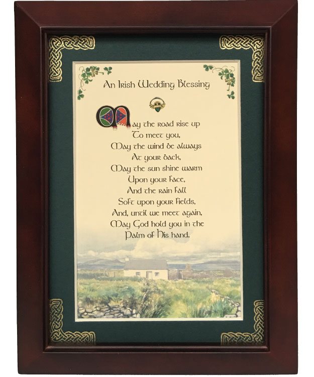 This 5 inch by 7 inch blessing comes printed on an ivory paper card stock. The forest green matte has been hand embossed with a Celtic knot work embellishment. The frame is a dark walnut wood frame of Italian design and both an easel and a hanger for display.