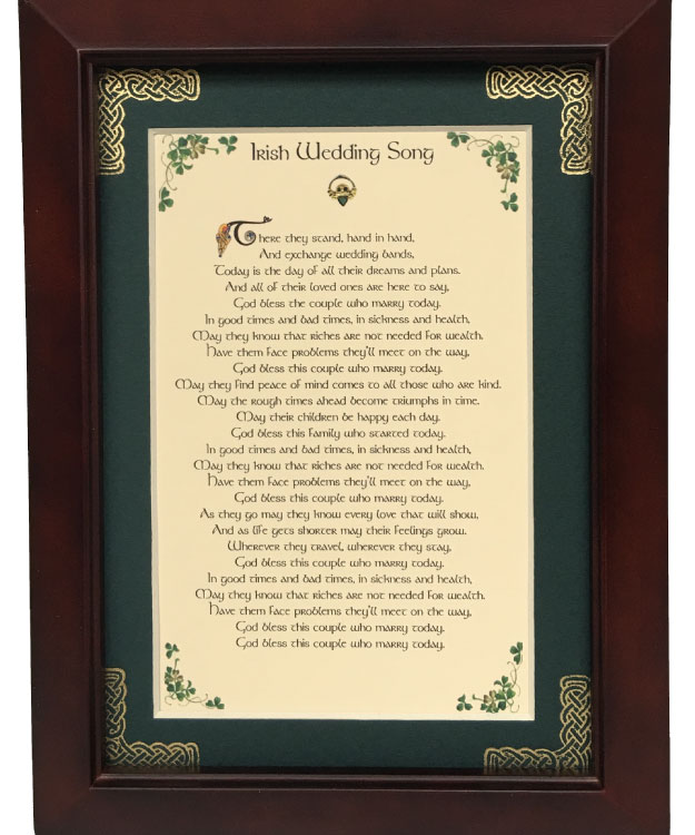 This 5 inch by 7 inch blessing comes printed on an ivory paper card stock. The forest green matte has been hand embossed with a Celtic knot work embellishment. The frame is a dark walnut wood frame of Italian design and both an easel and a hanger for display.