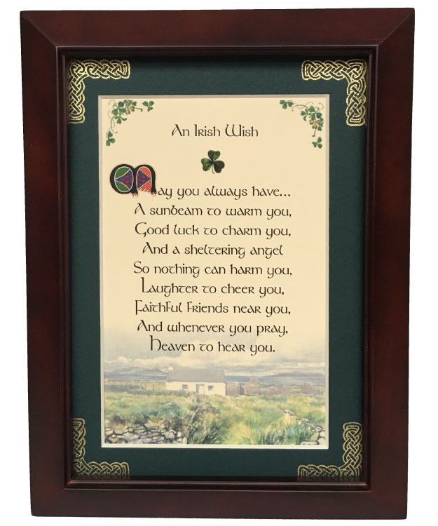 This 5 inch by 7 inch blessing comes printed on an ivory paper card stock. The forest green matte has been hand embossed with a Celtic knot work embellishment. The frame is a dark walnut wood frame of Italian design and both an easel and a hanger for display.
