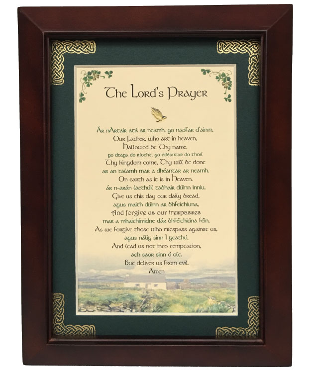 This 5 inch by 7 inch blessing comes printed on an ivory paper card stock. The forest green matte has been hand embossed with a Celtic knot work embellishment. The frame is a dark walnut wood frame of Italian design and both an easel and a hanger for display.